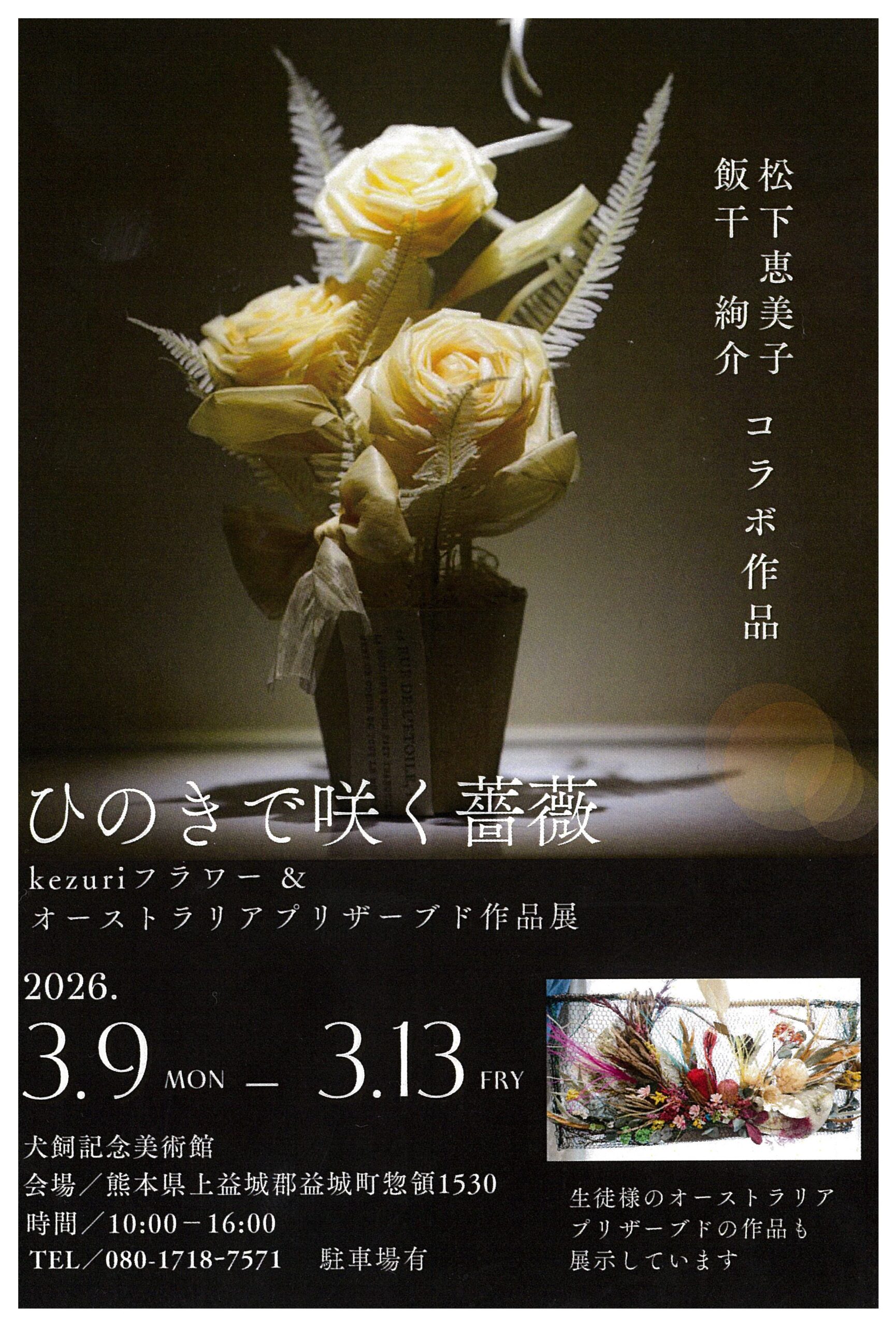 会期 ①3月9日(月)から3月13日(金)「ひのきで咲く薔薇」~kezuriフラワー&オーストラリアプリザーブド作品展~